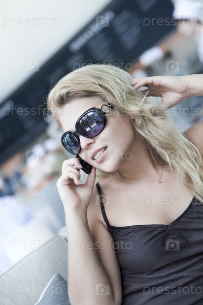 Блондинка в солнцезащитных очках говорит по мобильному телефону
