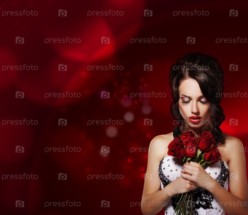 Мечтательная женщина с букетом цветов на фиолетовом фоне