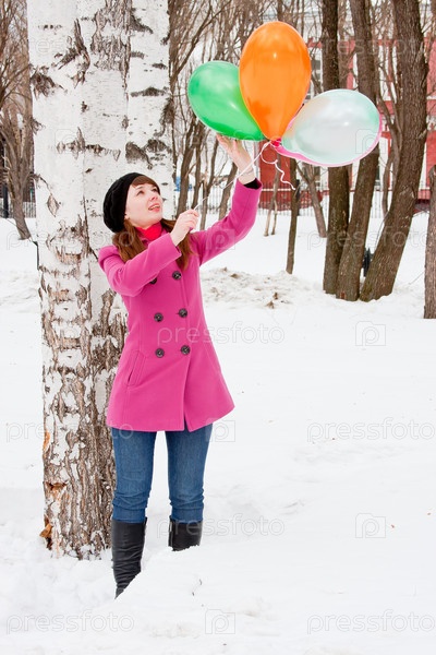 Молодая симпатичная девушка в пальто с воздушными шарами зимой