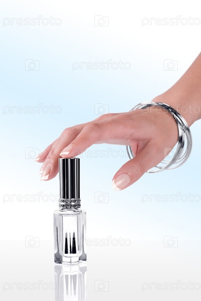 Женская рука и бесцветный лак для ногтей на светлом фоне