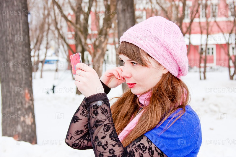 Молодая симпатичная девушка смотрит в зеркало зимой в парке