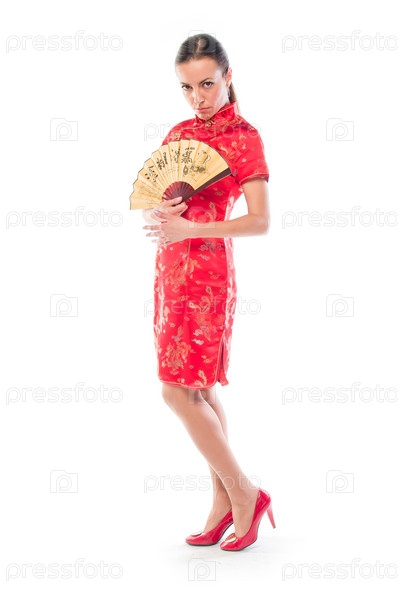 Молодая и красивая женщина в красном традиционном китайском платье