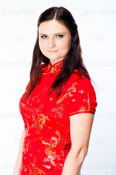 Молодая и красивая женщина в красном традиционном китайском платье