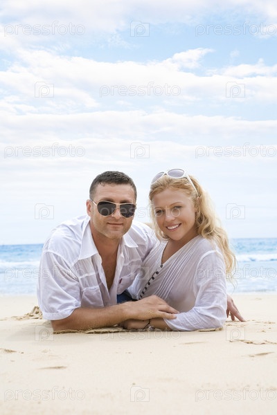 Влюбленная пара лежит на морском пляже