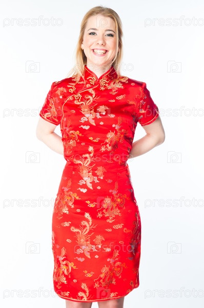 Молодая и красивая женщина в красном традиционном китайском платье