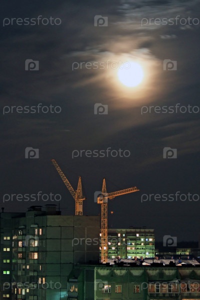 Два строительных крана и луна в темном небе