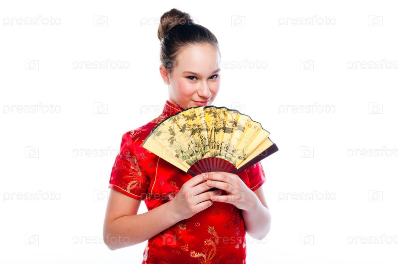 Молодая и красивая женщина в красном традиционном китайском платье