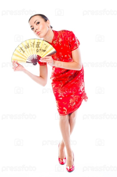 Молодая и красивая женщина в красном традиционном китайском платье