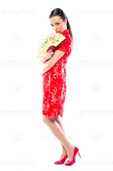 Молодая и красивая женщина в красном традиционном китайском платье