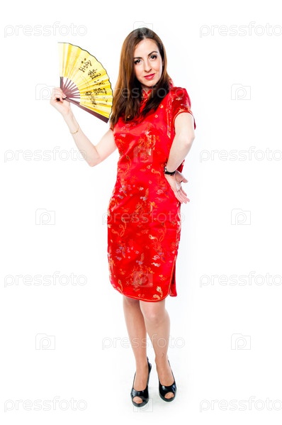 Молодая и красивая женщина в красном традиционном китайском платье