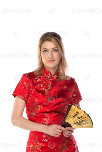 Молодая и красивая женщина в красном традиционном китайском платье
