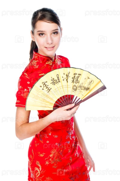 Молодая и красивая женщина в красном традиционном китайском платье