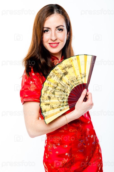 Молодая и красивая женщина в красном традиционном китайском платье