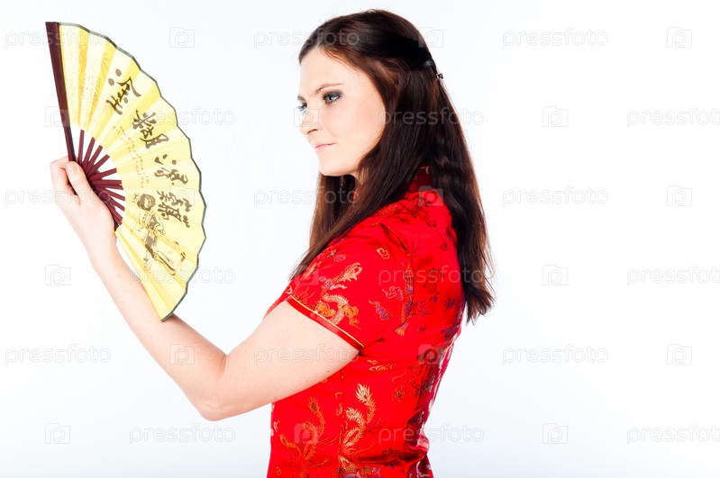 Молодая и красивая женщина в красном традиционном китайском платье