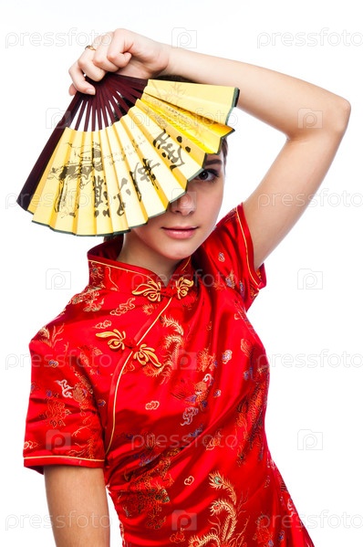 Молодая и красивая женщина в красном традиционном китайском платье