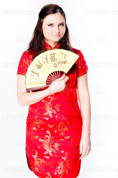 Молодая и красивая женщина в красном традиционном китайском платье