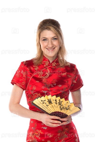 Молодая и красивая женщина в красном традиционном китайском платье