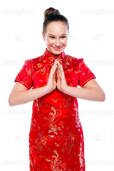 Молодая и красивая женщина в красном традиционном китайском платье