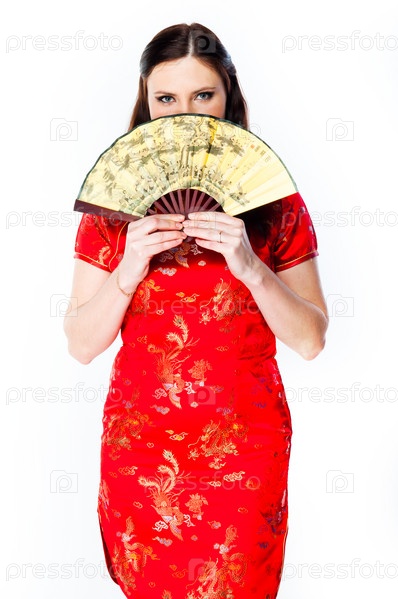 Молодая и красивая женщина в красном традиционном китайском платье