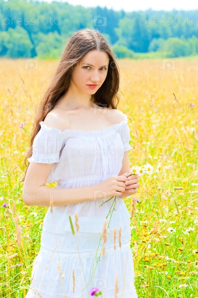 Портрет красивой девушки в белом сарафане на поле