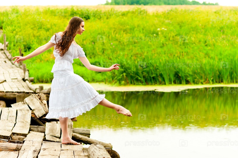 Девушка балансирует на одной ноге на мосту