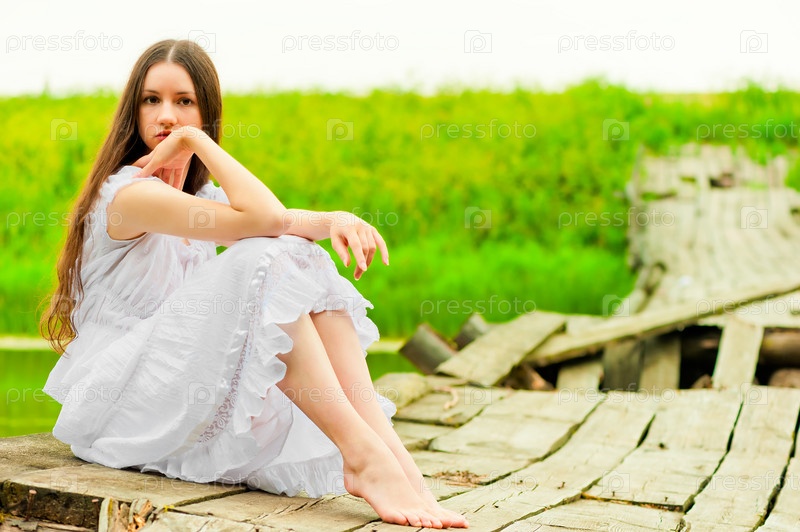 Девушка в белом сарафане отдыхает на мосту