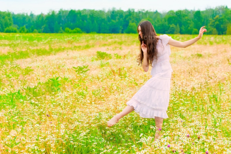 Молодая балерина танцует на поле ромашек