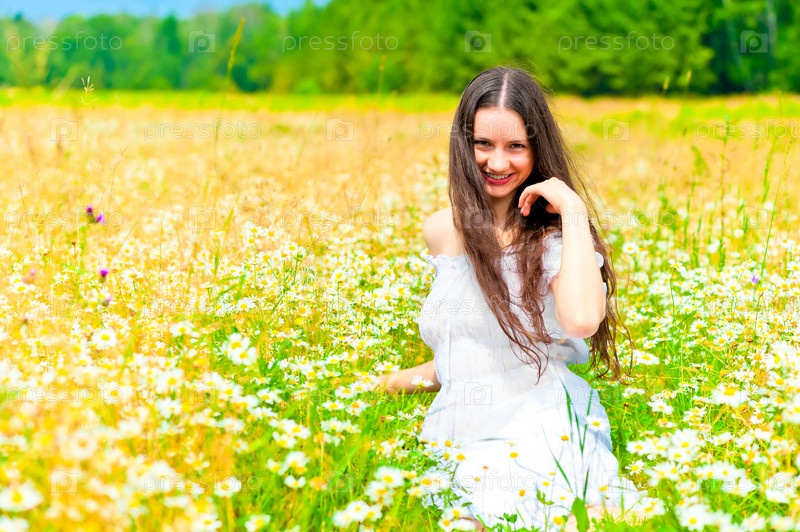 Улыбающаяся девушка лежит на ромашковом поле