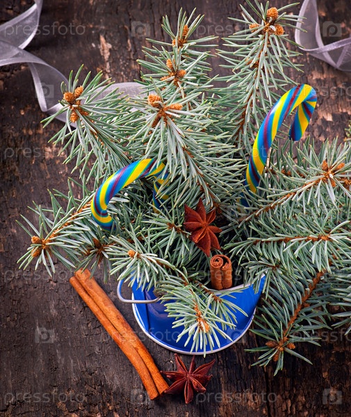 Рождественские украшения и еловые ветки в корзине на старой древесине