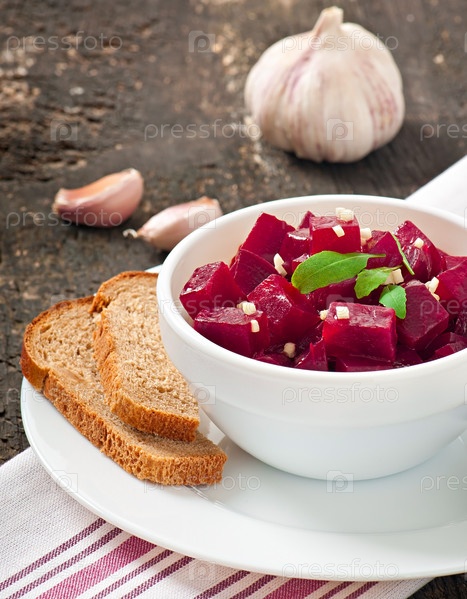 Салат из свеклы с чесноком в белой миске