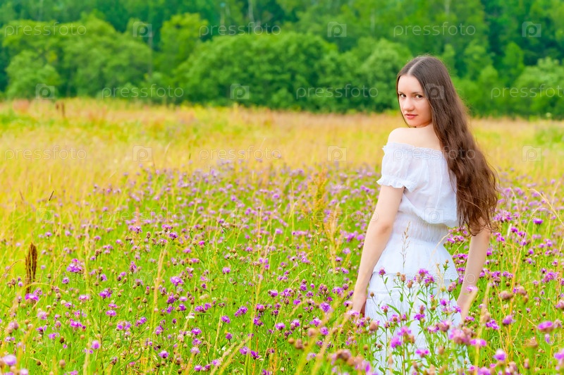 Красивая брюнетка на поле с фиолетовыми цветами