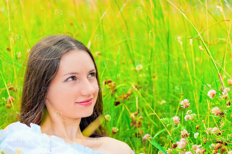 Портрет девушки в зеленой траве и клевере