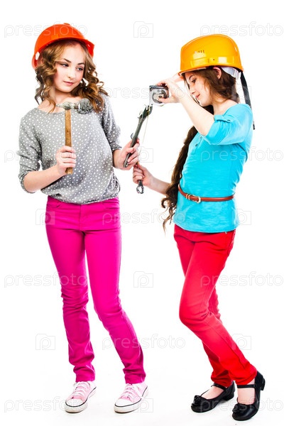 Две красивые девочки играют в строителей