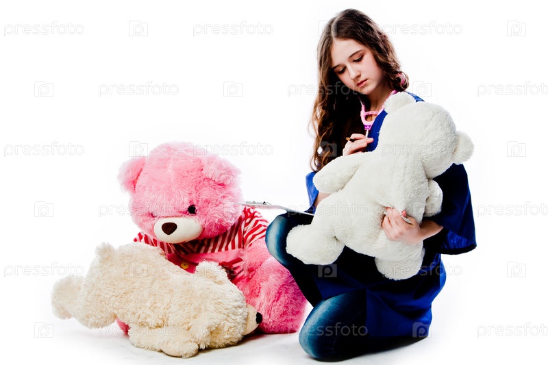 Красивая девочка в халате врача лечит плюшевых медведей