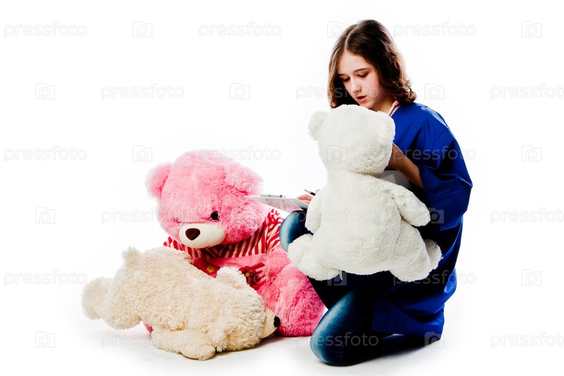 Красивая девочка в халате врача лечит плюшевых медведей