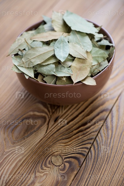 Чаша сушеного лаврового листа на деревянном столе