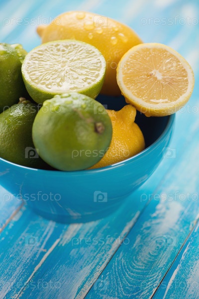 Лимоны и лаймы в миске на деревянном фоне