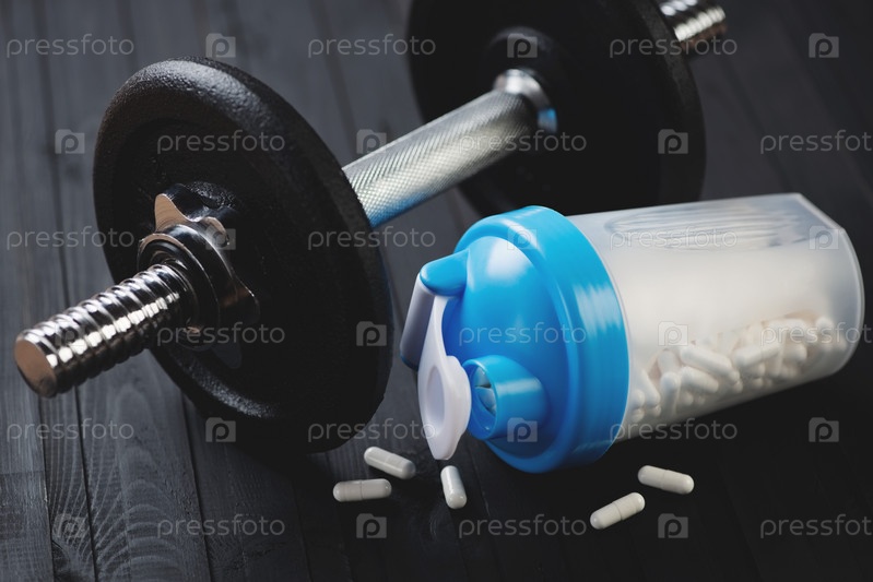 Стероиды: шейкер с таблетками и гантель