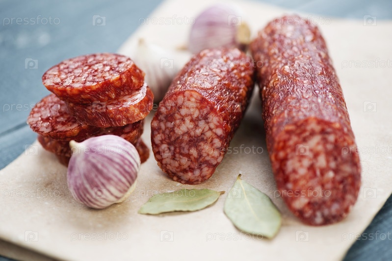 Итальянская салями, лавровые листья и чеснок на бумаге