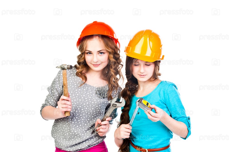 Две молодые красивые женщины в строительных касках