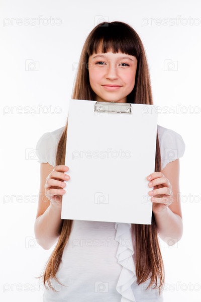 Красивая девочка с белой планшетной доской