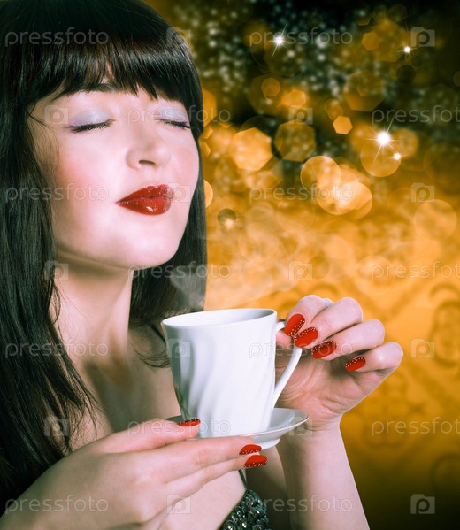 Красивая девушка с чашкой кофе на праздничном фоне