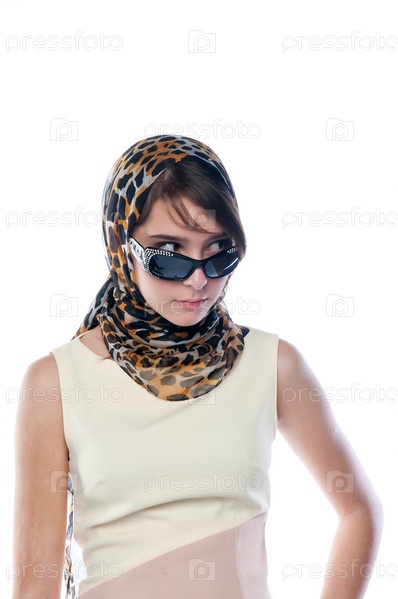 Красивая молодая женщина в платке и темных очках