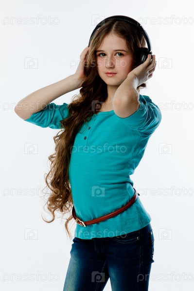 Красивая девочка слушает музыку в наушниках