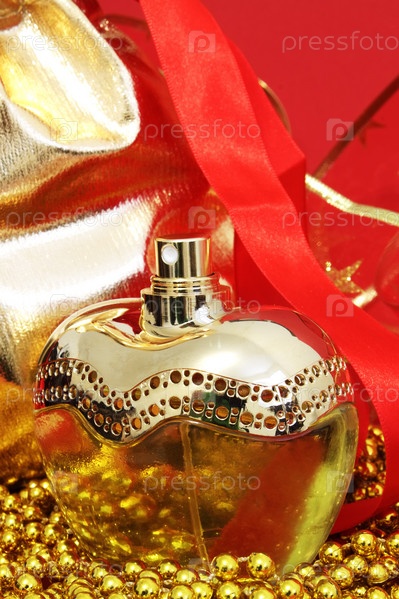 Бутылка парфюма на красном фоне