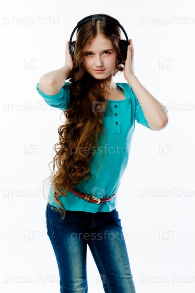 Красивая девочка слушает музыку в наушниках