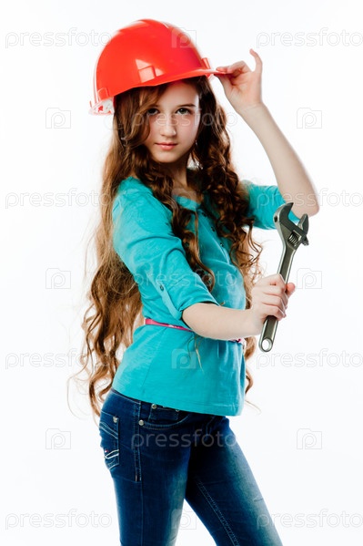 Красивая девочка в строительном шлеме и с инструментами