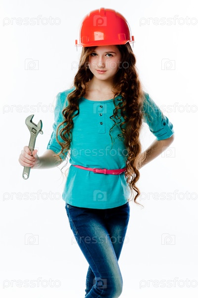 Красивая девочка в строительном шлеме и с инструментами