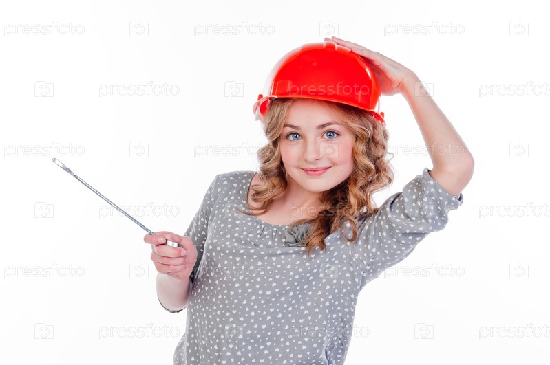 Красивая девочка в строительном шлеме и с инструментами