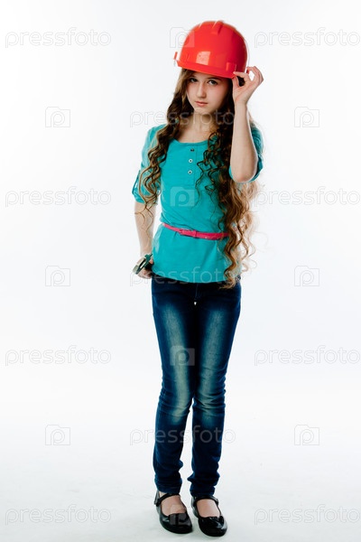 Красивая девочка в строительном шлеме и с инструментами